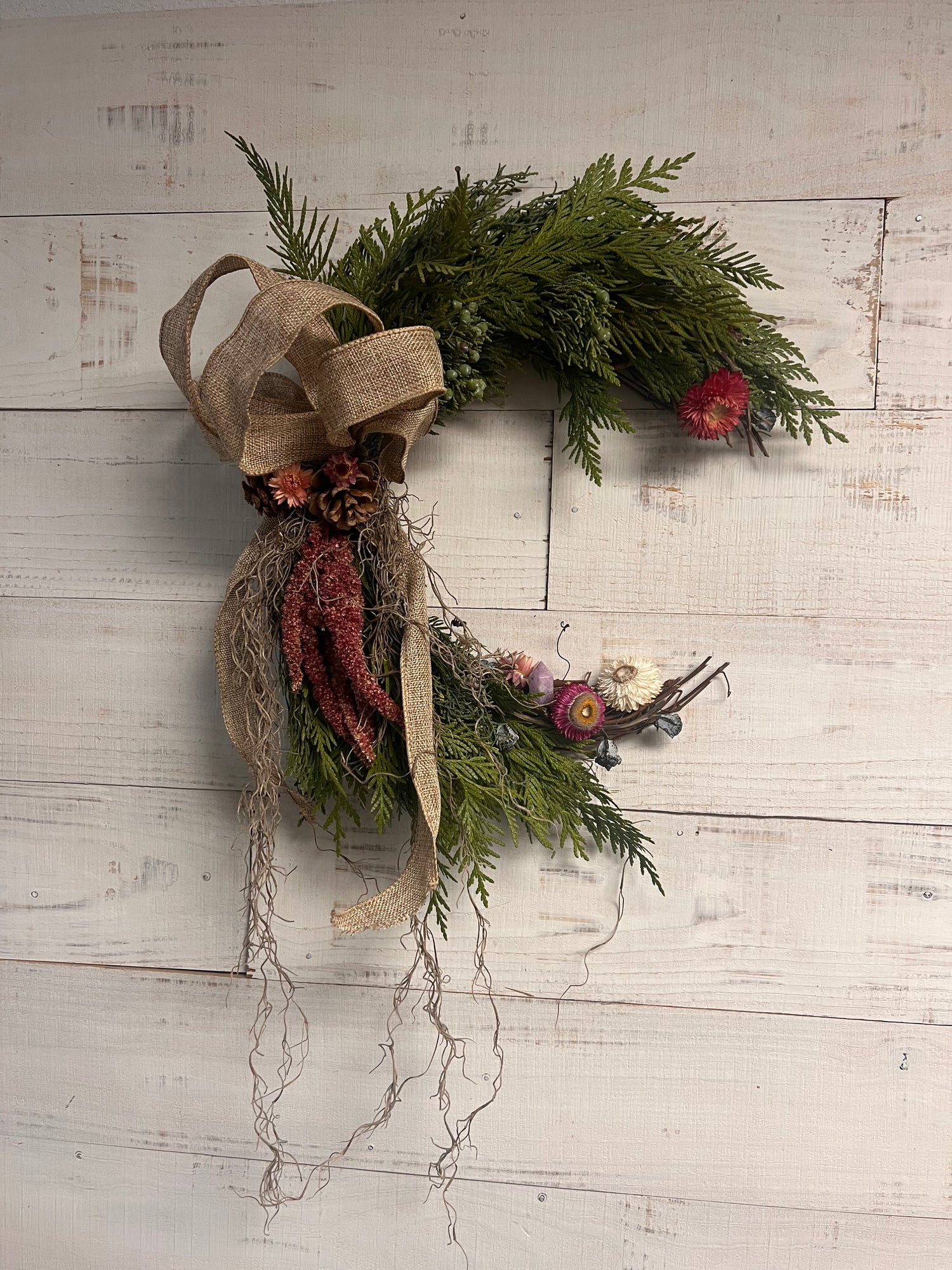 Looking for something more personal? Wreaths can be customized to suit your style, from classic greens to dried florals, crystals, bows, or a more wild, nature-inspired look.