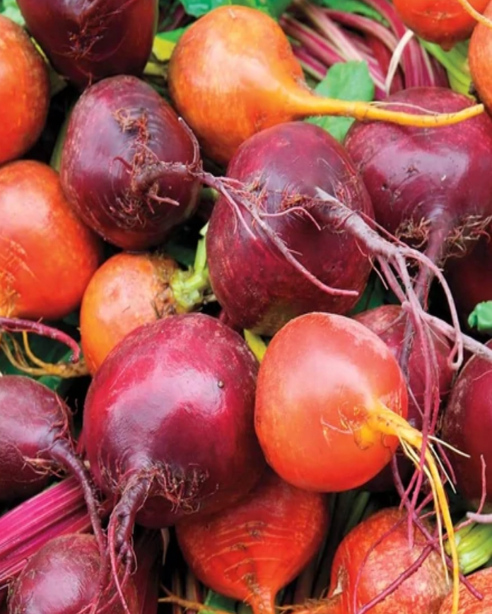 Beta vulgaris. Can't choose which beet to grow? Try this multicoloured beet blend. It represents the best and brightest of our beet varieties for high performance and great flavour. Get the most variety out of this colourful, tasty, dynamic blend of beet seeds. This easy to grow vegetable may be eaten from foliage to root. Beets can grow in cool months and can take some frost. Beets are high in Vitamin C, folic acid, antioxidants, minerals, fibre, and potassium. They also contain betaine, a compound that is essential for cardiovascular health.
