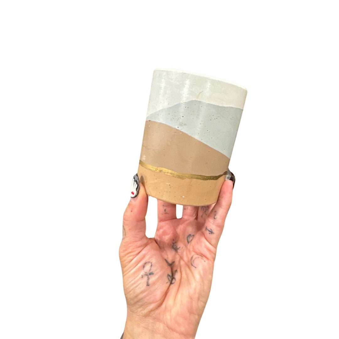 Beautifully handmade pots by local female artist. Solid concrete with timeless designs. Used as cover pots, but can be planted directly with cacti or other options if need be.