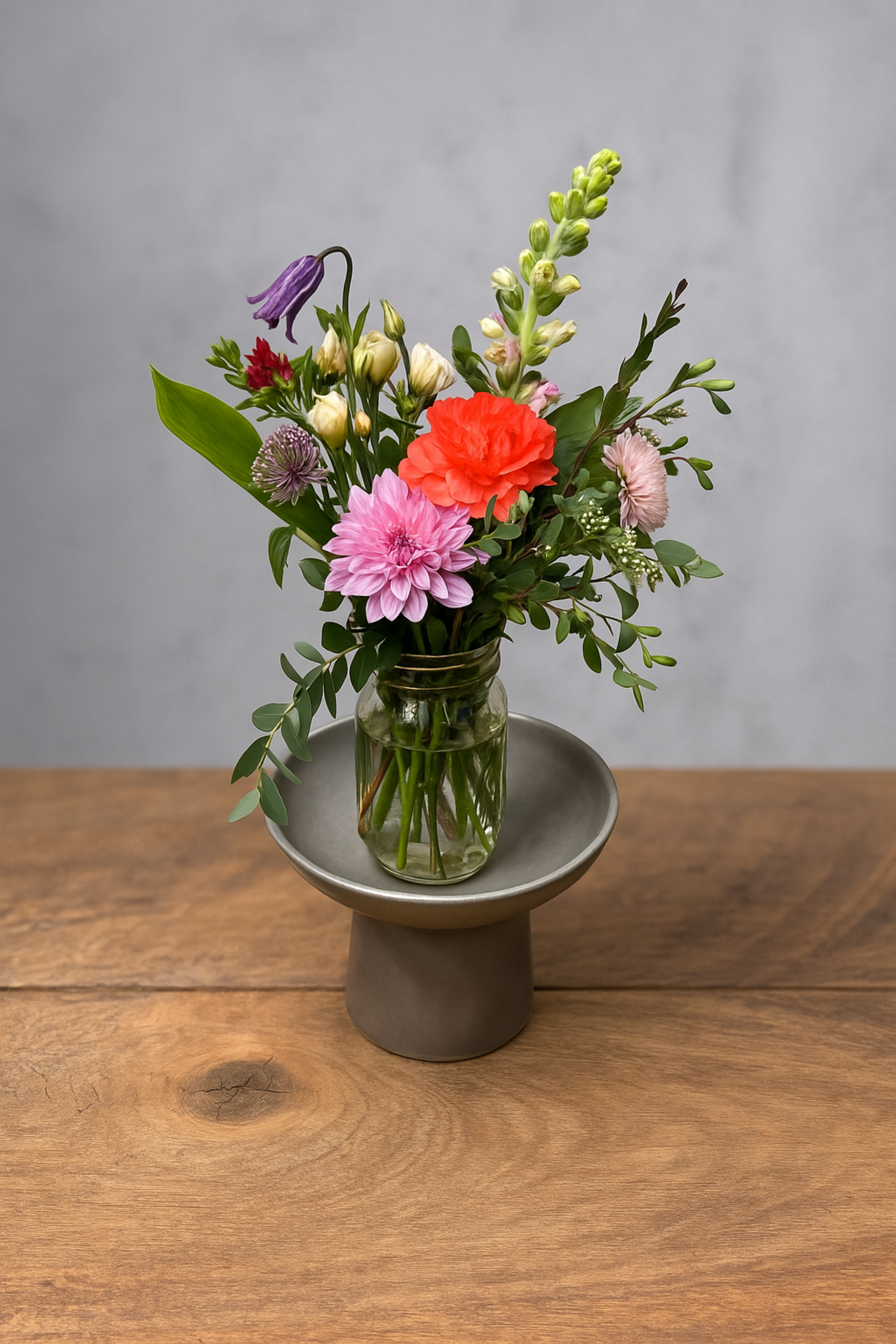The “Jam Jar” is a floral creation in a mason jar bursting with greens and blooms. Designed to capture the charm of a fresh garden bouquet, this arrangement overflows with vibrant colors and varied textures. Featuring a delightful mix of seasonal flowers—such as bold dahlias, soft lisianthus, radiant carnations, and whimsical clematis—nestled among lush foliage, each bouquet is unique and hand-arranged to bring joy and natural elegance to any space. Perfect as a thoughtful gift or a charming accent for your home or office, the Jam Jar is a refreshing celebration of nature’s beauty in a compact, rustic vessel.