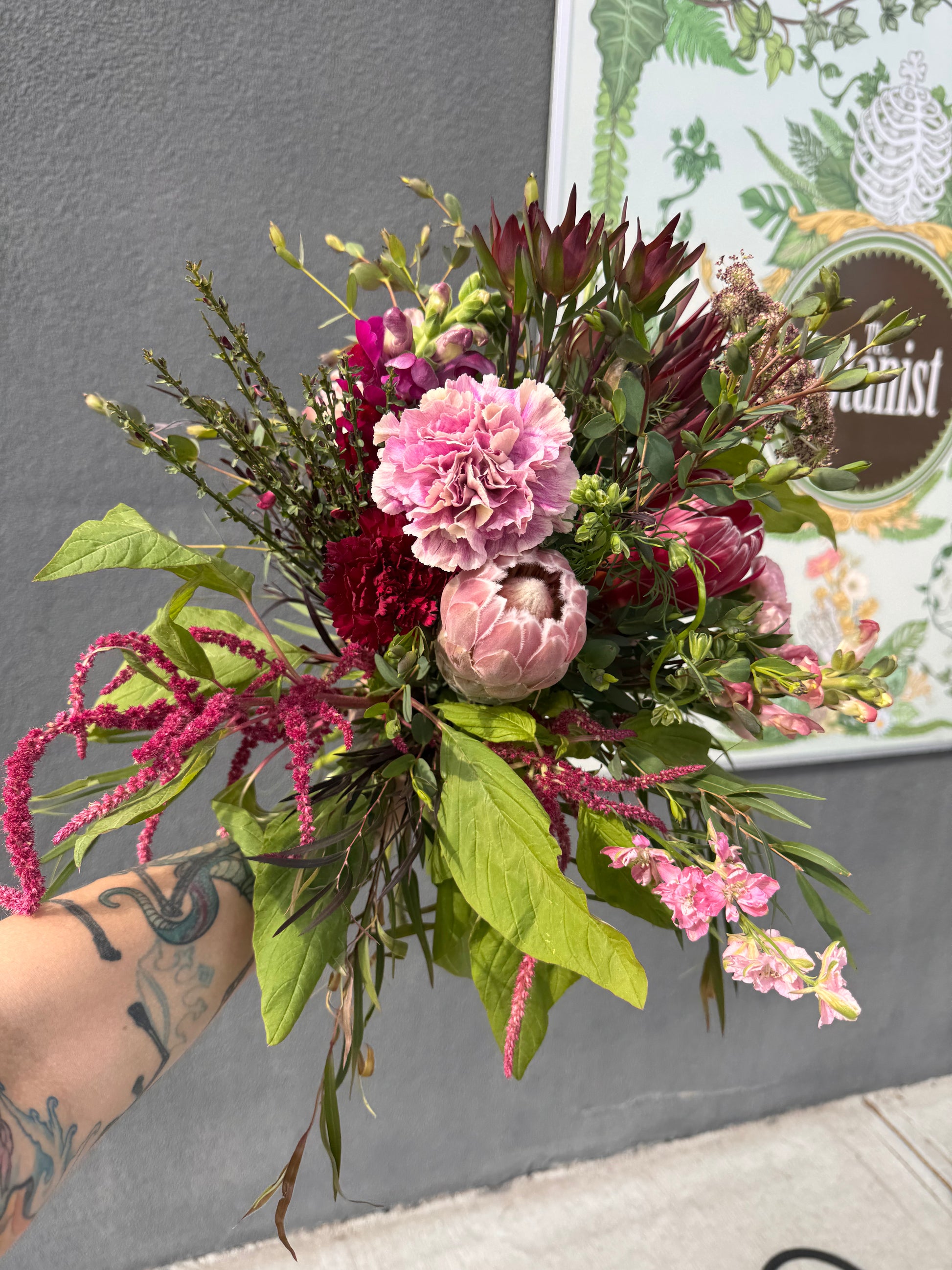 The Queen is a bold and sculptural arrangement featuring extraordinary blooms from the Proteaceae family, including the iconic Queen Protea and other striking varieties from the genus. Known for their exceptional vase life, proteas also dry beautifully — allowing them to be kept and admired long after their fresh life has passed.