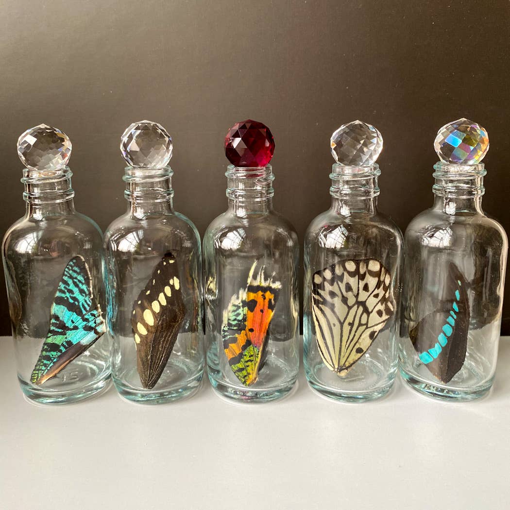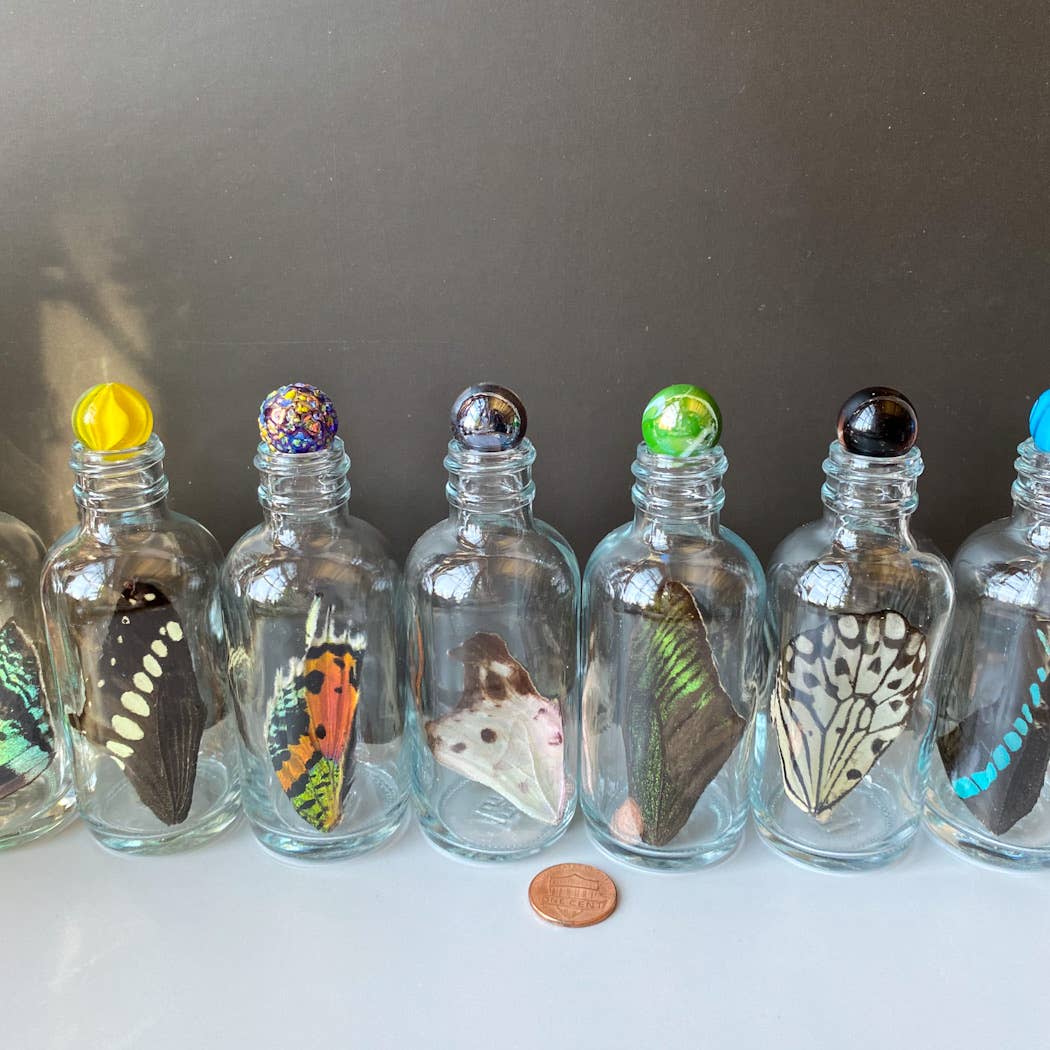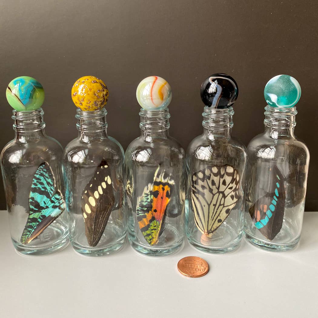 Real ethically sourced butterfly wing in a Xlarge size glass bottle. Choice of cork, glass marble, big glass marble, or Swarovski crystal closure. Corks are removable, marbles & crystals are not. Moth and other gorgeous real wings may be included. Bottle sizes may vary slightly. Funds conservation.